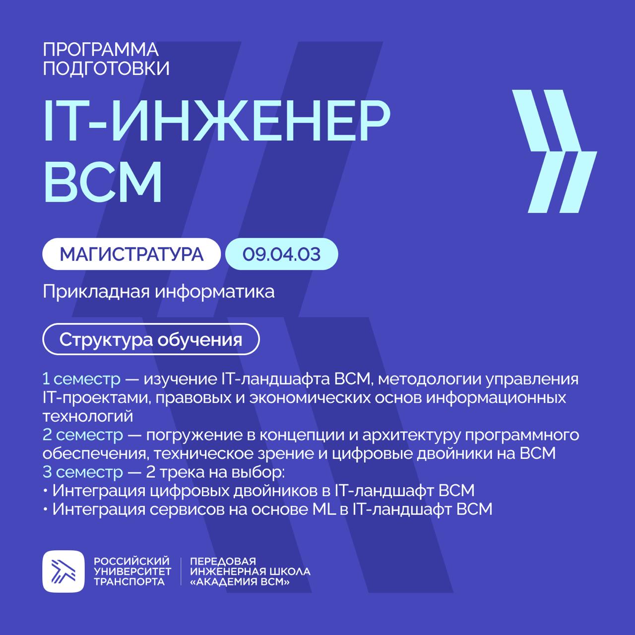 Передовая инженерная школа «Академия ВСМ» РУТ запускает новую магистерскую программу «IT-инженер ВСМ» (09.04.03, Прикладная информатика) очной формы обучения.